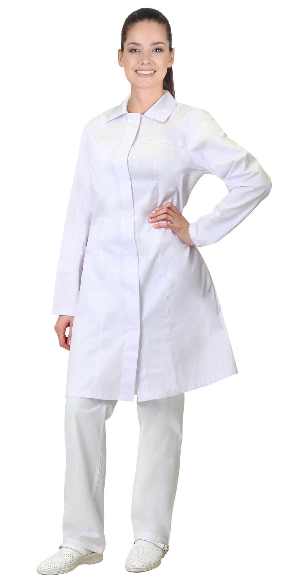 Халат женский прямого силуэта с длинными рукавами, центральной застежкой на потайные кнопки и втачным отложным воротником. Внутренний нагрудный карман и внутренний карман на правом рукаве для пропуска.Халат для пищевого производства отвечает требованиям НАССР (ХАССП). Гигиеническая безопасность костюма достигается за счет внутренних карманов и скрытых застежек.