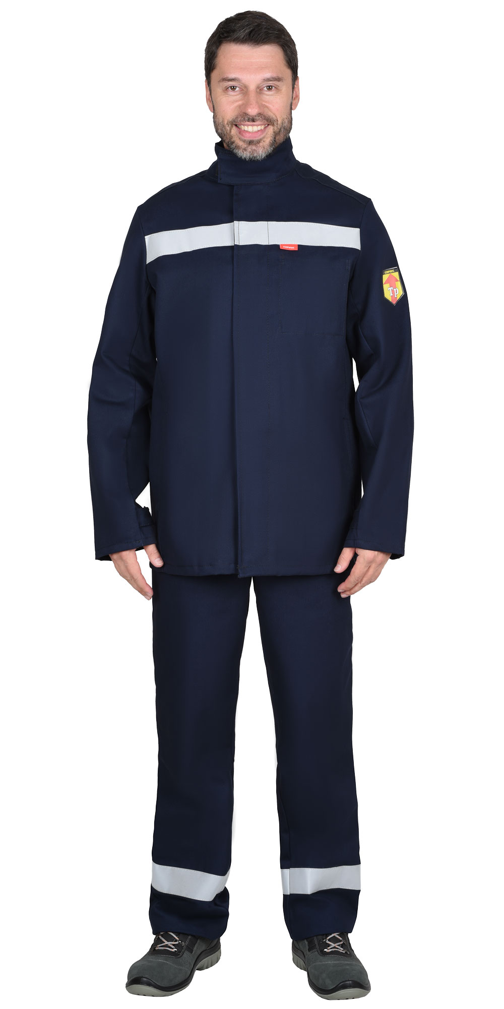 Костюм летний из огнестойкой ткани, состоит из куртки, удлинённой и брюк. В костюме предусмотрена светоотражающая лента шириной 50мм для обозначения сигнальной видимости.Куртка, удлиненная с потайной застёжкой на огнестойкие пуговицы, с внутренними карманами в швах. Воротник-стойка с застежкой на «липучку». На левой полочке с изнаночной стороны внутренний накладной карман с именной лентой. На куртке под проймой вентиляционные отверстия для воздухообмена. Ширина рукавов понизу регулируется хлястиками с пуговицами.Брюки с застежкой в боковых швах на огнестойкие пуговицы. Передние половинки с внутренними карманами в боковых швах и накладным карманом на правой передней половинке.Костюм 1-ого класса защиты, предназначен для выполнения работ, при которых расстояние от работящего до источника искр и брызг расплавленного металла более 2-х метров.