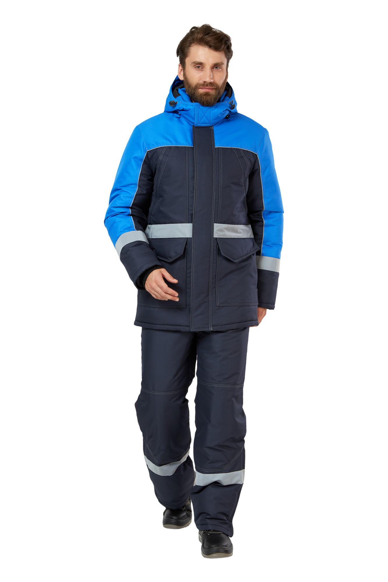 • Визуальные элементы защиты: световозвращающие полосы шириной 50 мм в верхней части спинки, вокруг торса по линии талии, низу рукавов и средней части капюшона; световозвращающий кант на капюшоне, кокетках полочек и спинки, средней части рукавов