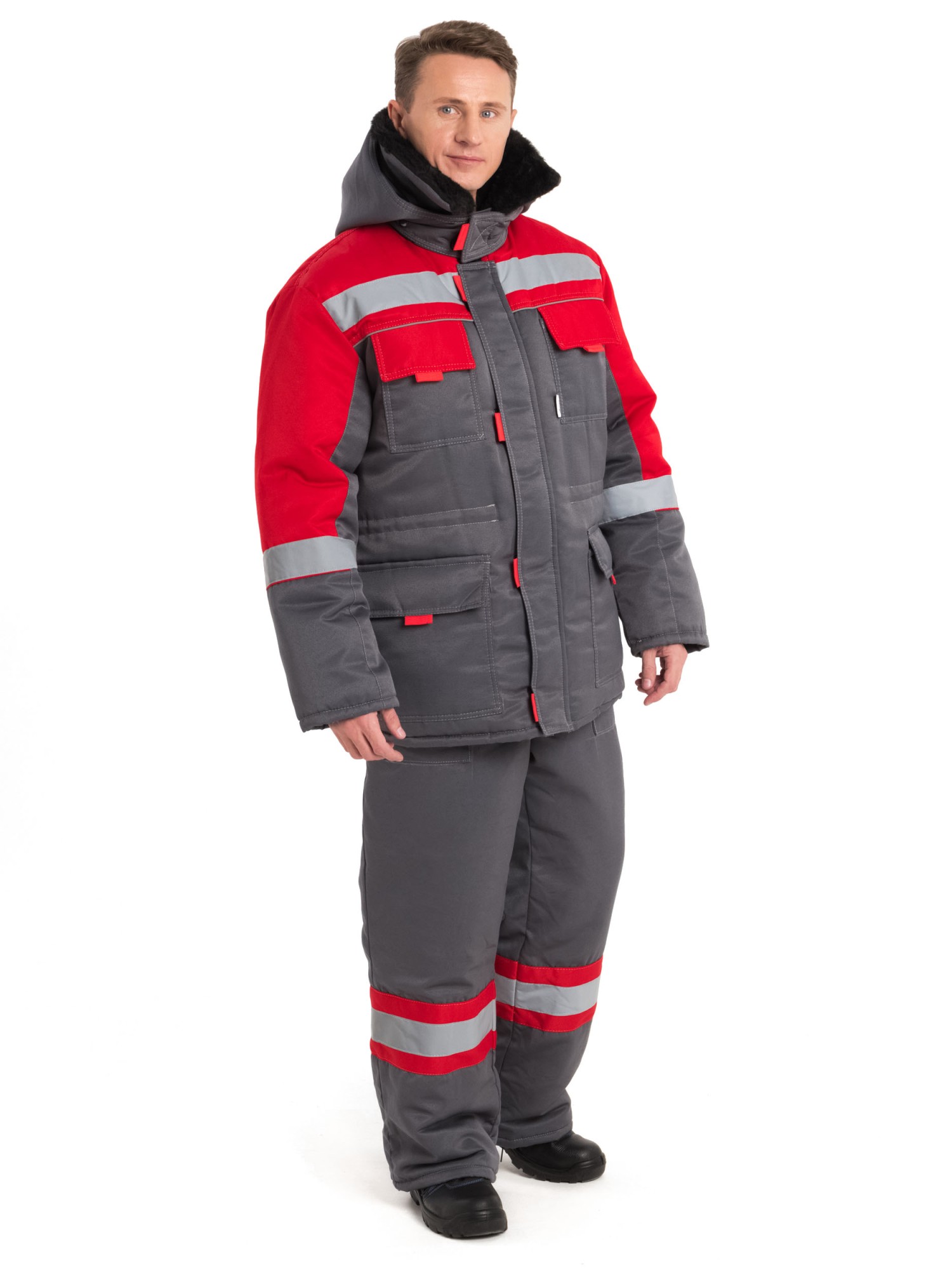 - Куртка со световозвращающими полосами, с центральной бортовой застежкой на молнию, с ветрозащитным клапаном на липучках.