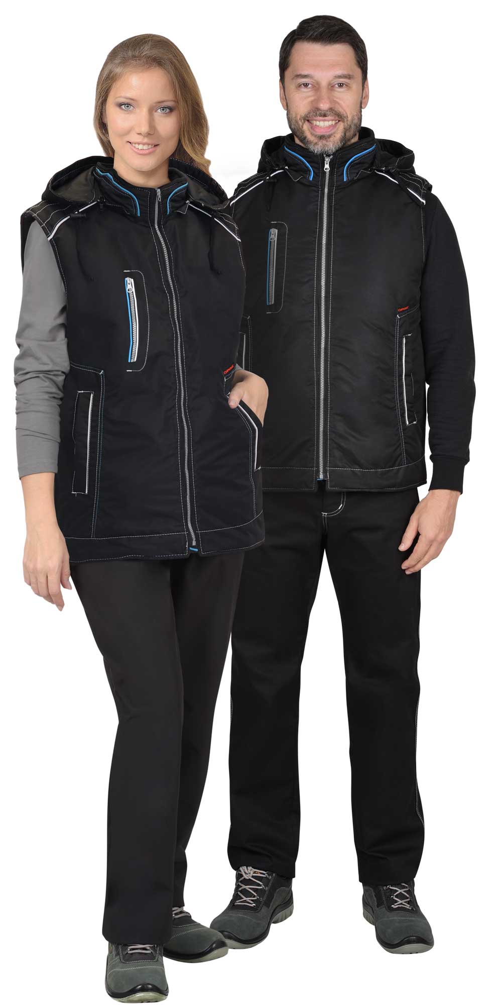 - Жилет с воротником стойка, с застёжкой на молнию, с внутренним ветрозащитным клапаном, со съёмным капюшоном, который пристёгивается к воротнику на молнию.