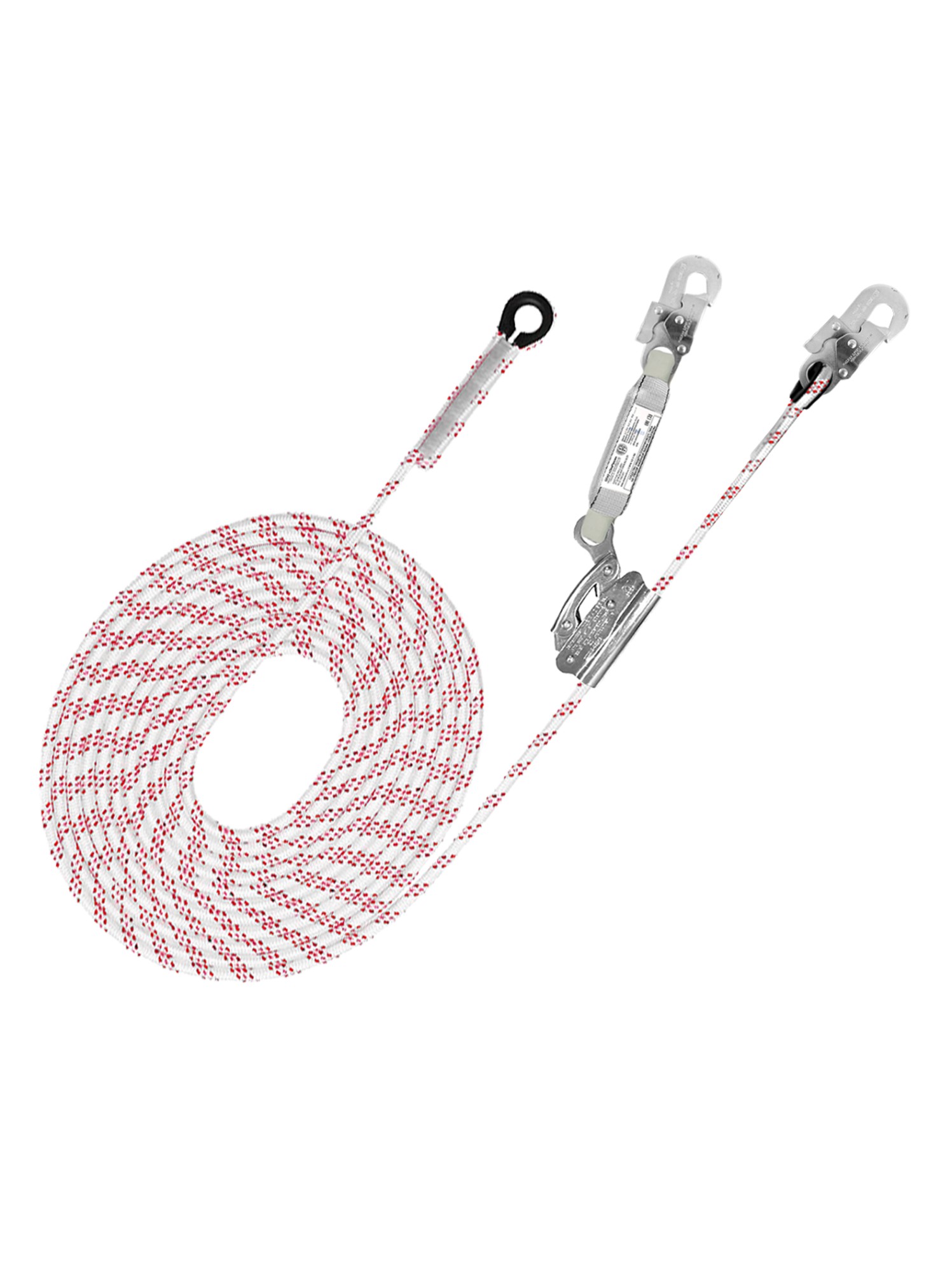 Анкерная линия представляет собой полиамидный шнур с индикатором изнашивания диаметром 12 мм, с обеих сторон оснащена петлями с коушами, на одном конце закреплен соединительный монтажный карабин класса Т с раскрытием 18 мм (для присоединения к анкерной точке), другой конец используется для закрепления к нижней анкерной точке или присоединения груза-фиксатора (от 1 кг).