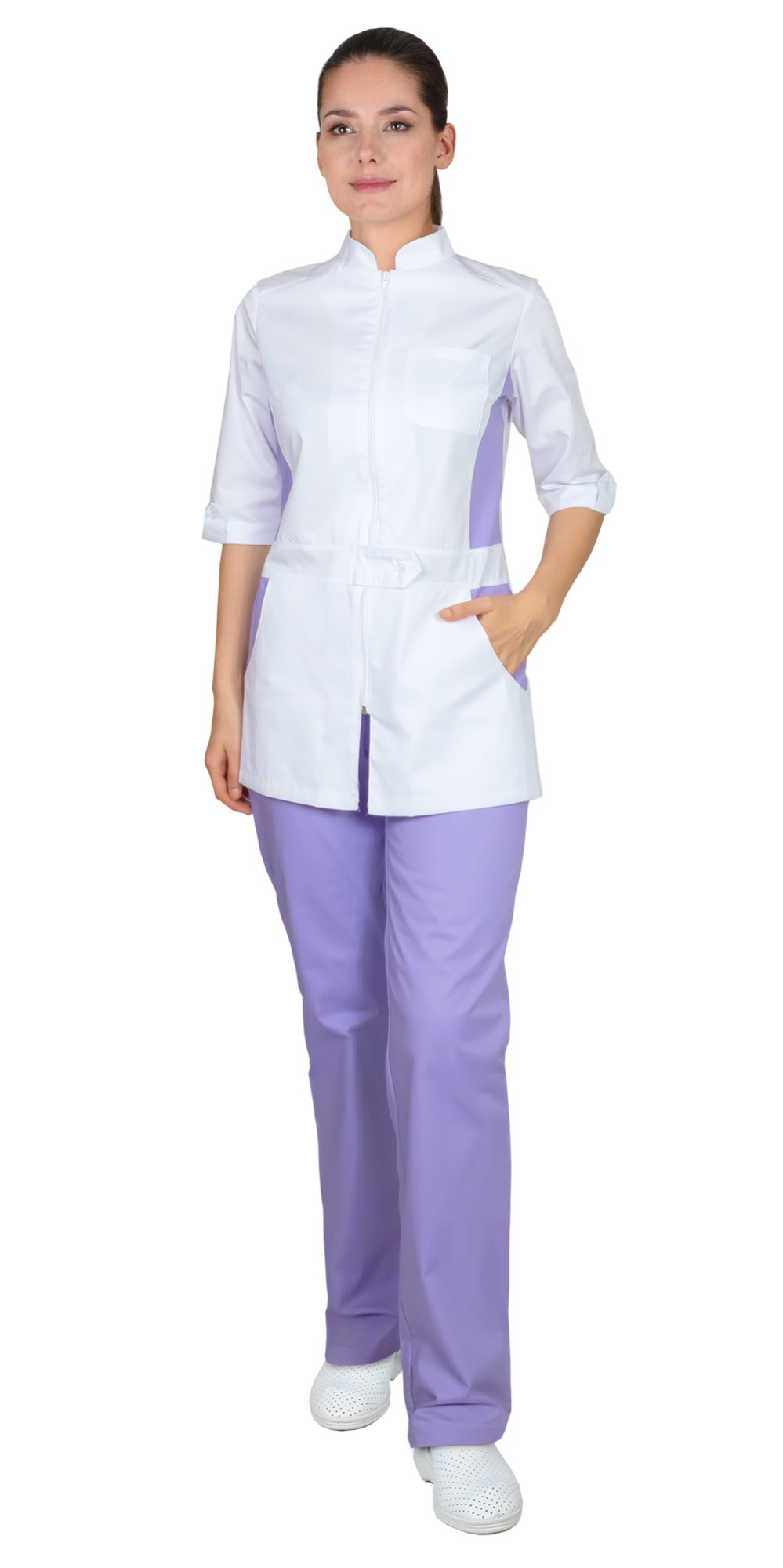 Удобный и функциональный костюм из легкой и дышащей ткани. Состоит из блузы полуприлегающего кроя с молнией и прямых брюк. Воротник стойка, рукав 3/4 и два внутренних кармана делают блузу элегантной и функциональной. Брюки на притачном поясе, который частично стянут на эластичную тесьму, обеспечивают комфорт в течение длительного времени.Классическая комбинация белого и бежевого цветов создают нежный и элегантный визуальный эффект. Костюм идеально подойдет для работников медицинской и бьюти сфер.