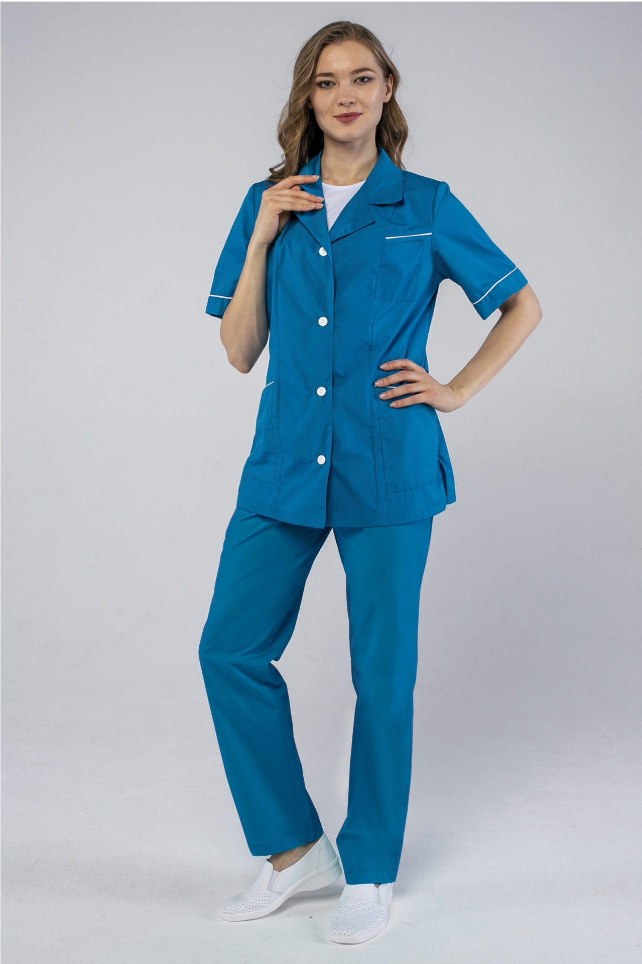 - Блуза: прямого силуэта, центральная застежка на пуговицы.