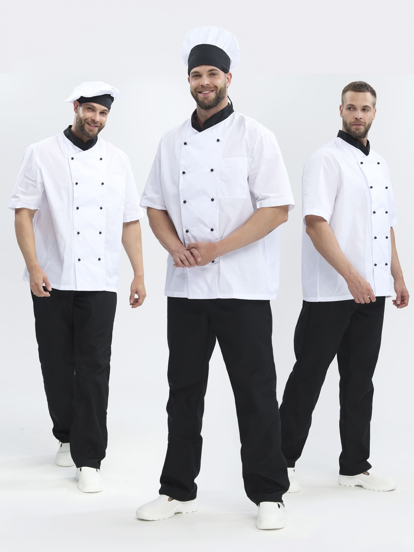 Китель: оснащен двубортной застежкой на пукли и воротником-стойкой контрастного черного цвета. Прямой силуэт и свободный фасон кителя обеспечивают комфорт во время работы. Короткий рукав не мешает приготовлению пищи, а нагрудный карман подходит для хранения записей.