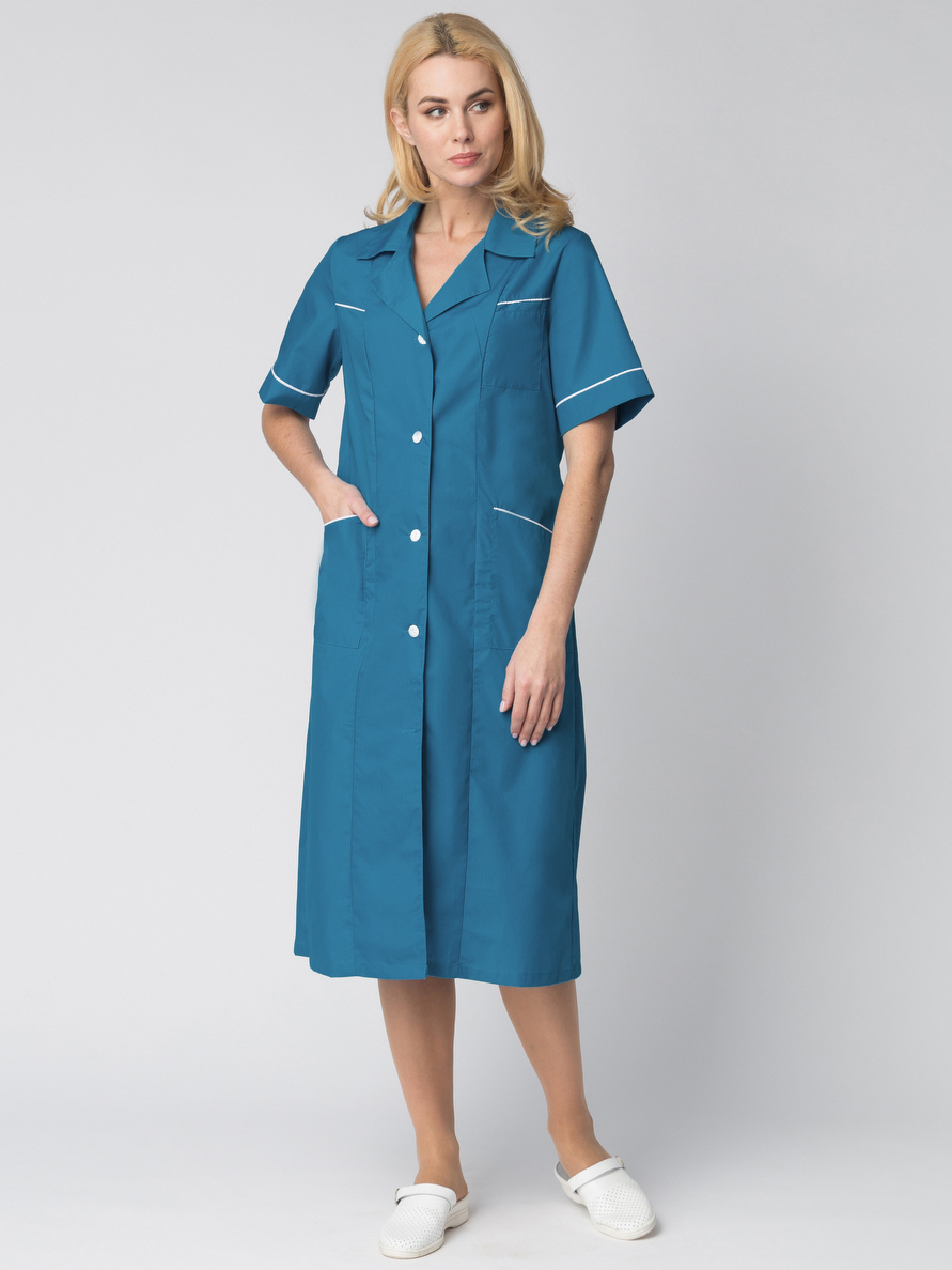 Халат: прямого силуэта, длина ниже колена. Центральная застежка на пуговицы. Втачной короткий рукав. Задняя шлица. Отложной «английский» воротник. Боковые вместительные карманы. Нагрудный ассиметричный карман. Регулировка объема по талии вшивным поясом на пуговице. Контрастным белым кантом отделаны кокетка, карманы и манжеты.