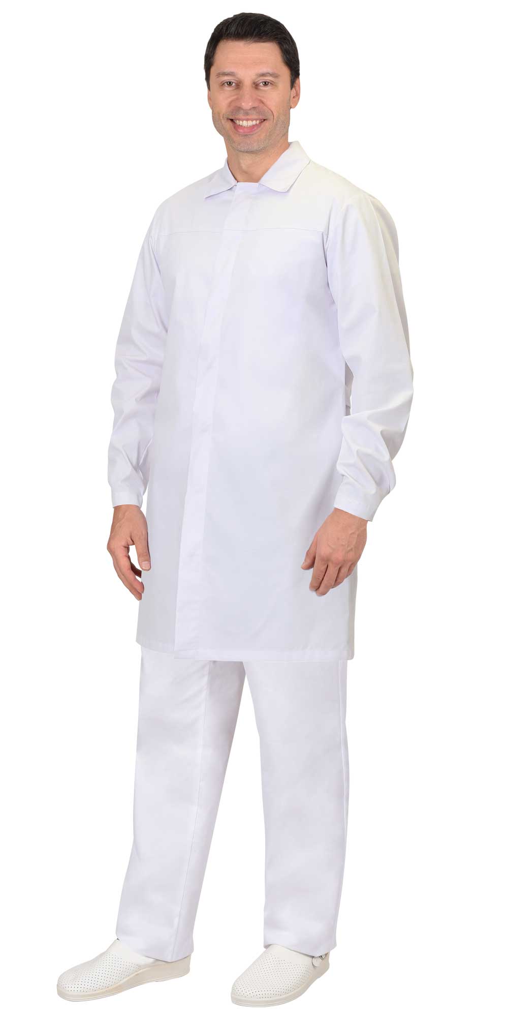 Халат мужской прямого силуэта с длинными рукавами, центральной застежкой на потайные кнопки и втачным отложным воротником. Внутренний нагрудный карман и внутренний карман на правом рукаве для пропуска.Халат для пищевого производства отвечает требованиям НАССР (ХАССП). Гигиеническая безопасность костюма достигается за счет внутренних карманов и скрытых застежек.