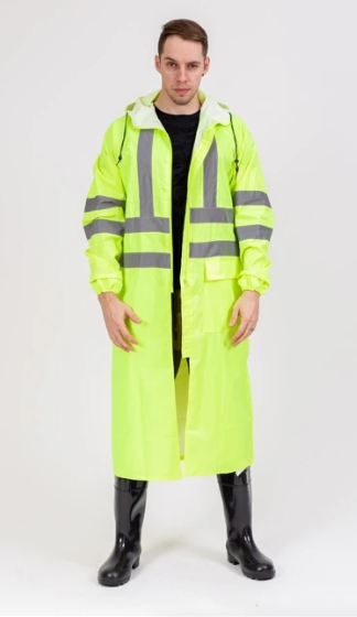 Изделие повышенной видимости 3-го класса, для защиты от воды 3-го класса. Плащ для защиты от воды с застежкой на молнию с ветрозащитной планкой, имеет капюшон, накладные карманы с влагозащитными клапанами, прошитые и герметично проклеенные швы, манжеты на рукавах. Спинка с кокеткой, отверстиями для вентиляции, закрытыми клапаном. Объем капюшона регулируется по лицевому вырезу шнуром. Светоотражающие полосы шириной 50 мм.