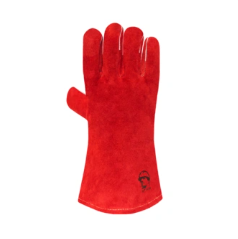 Краги из качественного спилка (толщина 1,1-1,2мм), пятипалые, красного цвета. Швы усилены спилковыми вставками и прошиты огнеупорной нитью KEVLAR
