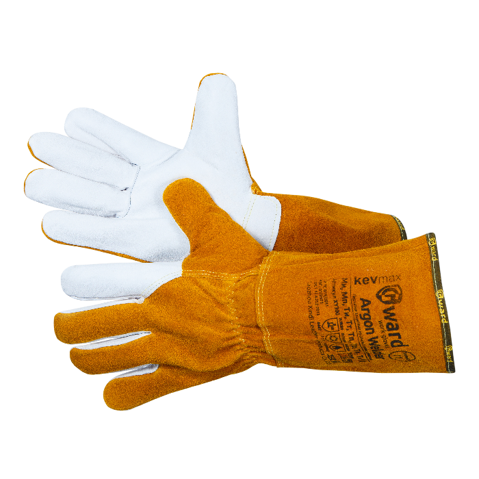 Комбинированные аргоновые краги. Основа перчатки изготовлена из спилка КРС оранжевого цвета, класса ААА, который сочетает в себе прочность, равномерность, мягкость и оптимальную толщину, для удобной защиты тыльной стороны ладони.Ладонь и указательный палец сшиты из высококачественной воловьей кожи белого цвета. Мягкая воловья кожа предназначена для аргоновой сварки и высокочувствительной работы, которая требует повышенную тактильность с предметами.Все части прошиты негорючими параарамидными нитями KEVMAX®Защищают от искр, брызг металла и открытого пламени (есть сертификат).Спилок высокого качества, плотный, мягкий, устойчивый к истиранию и порезам.Длинная крага защищает вены и препятствует попаданию окалин внутрь перчатки.Швы защищены кожаными вставками для защиты нитей от искр.Защитная резинка, не стесняя движений, позволяет перчатки плотно сидеть на руке.