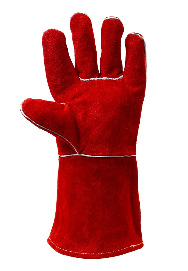 Краги из качественного спилка (толщина 1,2мм), пятипалые, красного цвета. Подкладка из плотной 100% хлопковой ткани, на тыльной и ладонной части дополнительный термоизолиющий слой флиса. Усиление швов:спилковыми вставками. Швы прошиты огнеупорной нитью KEVLAR.